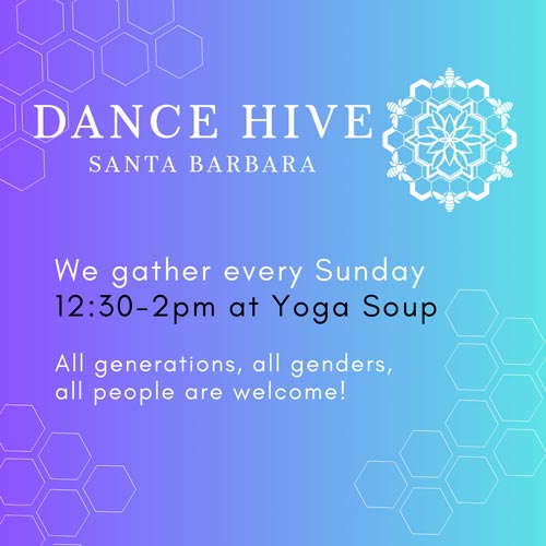 We invite you to celebrate life through movement! We gather on Sundays as a community for a conscious dance journey that welcomes authentic expression, freedom of movement, and embodied connection. **ALL GENERATIONS, ALL GENDERS, ALL PEOPLE WELCOME ** SCHEDULE: 12:30pm – Doors to dance open 2pm – Dance concludes _______________ DID YOU KNOW? Your entry fee is tax deductible! Dance Hive is hosted by INSPIRATIA, a registered 501c3 charitable organization. Your generous donations support our program expenses and our incredible Dance Hive staff. In order to honor the sacredness of our service we ask you to follow these agreements: RESPECT Respect and care for yourself and honor the boundaries of others. HONOR Honor the integrity of the ceremonial space by refraining from conversation. CONSENT Obtain consent before making physical contact with other dancers. NATURAL Attend ceremonies in a natural state, and refrain from using alcohol and drugs. SACRED Leave technological devices outside the sacred space. CONNECT Connect directly with the earth by being barefoot during ceremonies. HEALTHY Please do not attend the dance if you are experiencing immune symptoms of any kind. _______________ We dance EVERY Sunday of the month in Studio 2 at Yoga Soup in Santa Barbara. $20 donation entry fee. Children under 10 dance free. Financial support available – email info@inspiratia.org. Our conscious dance journey is the Sunday service of Inspiratia, a charitable organization. Inspiratia offers educational programs for individuals to develop their capacity for embodied presence and self awareness through meditation and movement practices. Learn more at inspiratia.org.