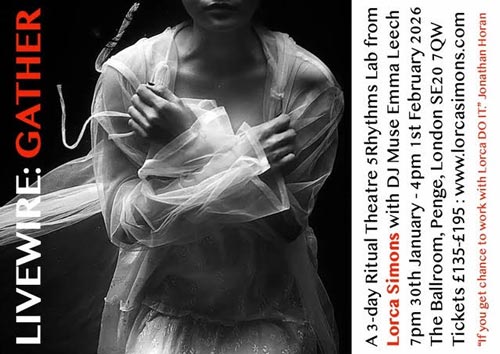 Live Wire is an embodied ritual theatre investigation, grounded in the movement maps of 5Rhythms®, devoted to the shapeshifting nature of physical art, and guided by the vision of Lorca Simons, Gabrielle Roth and Martha Peabody. Designed to inspire, refresh, re-set and connect. Our time will include movement, creative excavations, collective truth-telling and beauty-making.